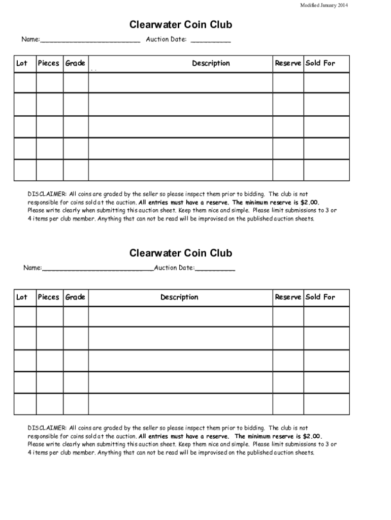 Modified January 2014Clearwater Coin Club Name:___ Auction Date: ___Codpieces GradeNnDescriptionReserve Sold Disclaimer: All coins are graded by the seller, so please inspect them prior to bidding.