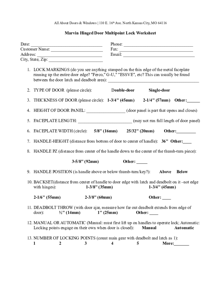 All About Doors & Windows | 110 E. 16th Ave. North Kansas City, MO 64116Marvin Hinged Door Multi point Lock Worksheet Date: ___ Customer Name: ___ Address: ___ City, State, Zip: ___Phone: ___ Fax: