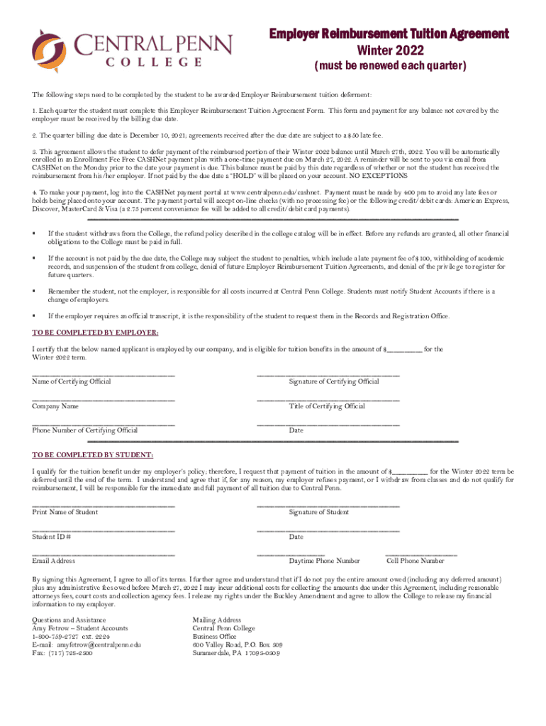 Employer Reimbursement Tuition Agreement Winter 2022 (must be renewed each quarter) The following steps need to be completed by the student to be awarded Employer Reimbursement tuition deferment: