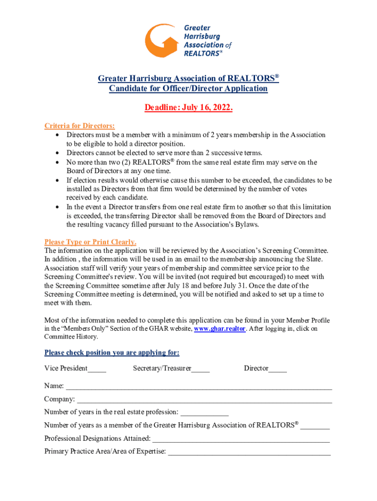 Greater Harrisburg Association of REALTORS Candidate for Officer/Director Application Deadline: July 16, 2022. Criteria for Directors: Directors must be a member with a minimum of 2 years membership