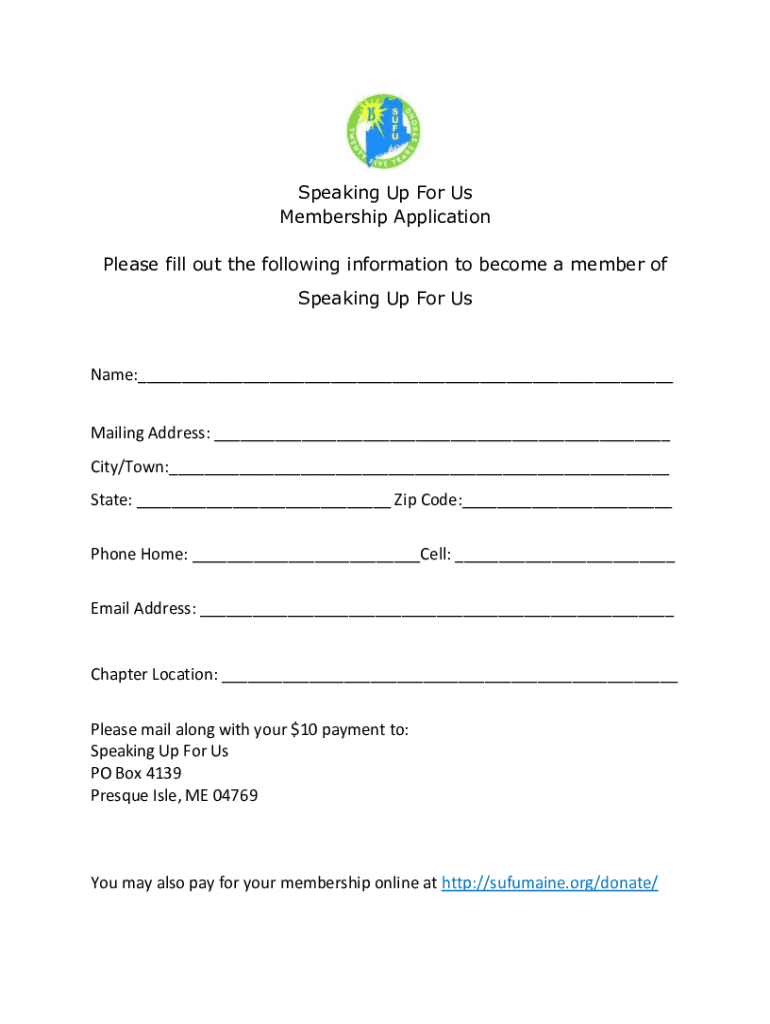 Speaking Up For Us Membership Application Please fill out the following information to become a member of Speaking Up For Name:___ Mailing Address: ___ City/Town:___ State: ___ Zip Code:___ Phone
