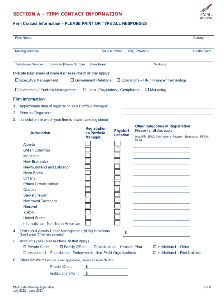 PORTFOLIO MANAGEMENT ASSOCIATION OF CANADA APPLICATION FOR MEMBERSHIP SECTIONS: A. FIRM CONTACT INFORMATION B. TERMS AND CONDITIONSPlease return completed application via: Email: info@pmac.org Letter
