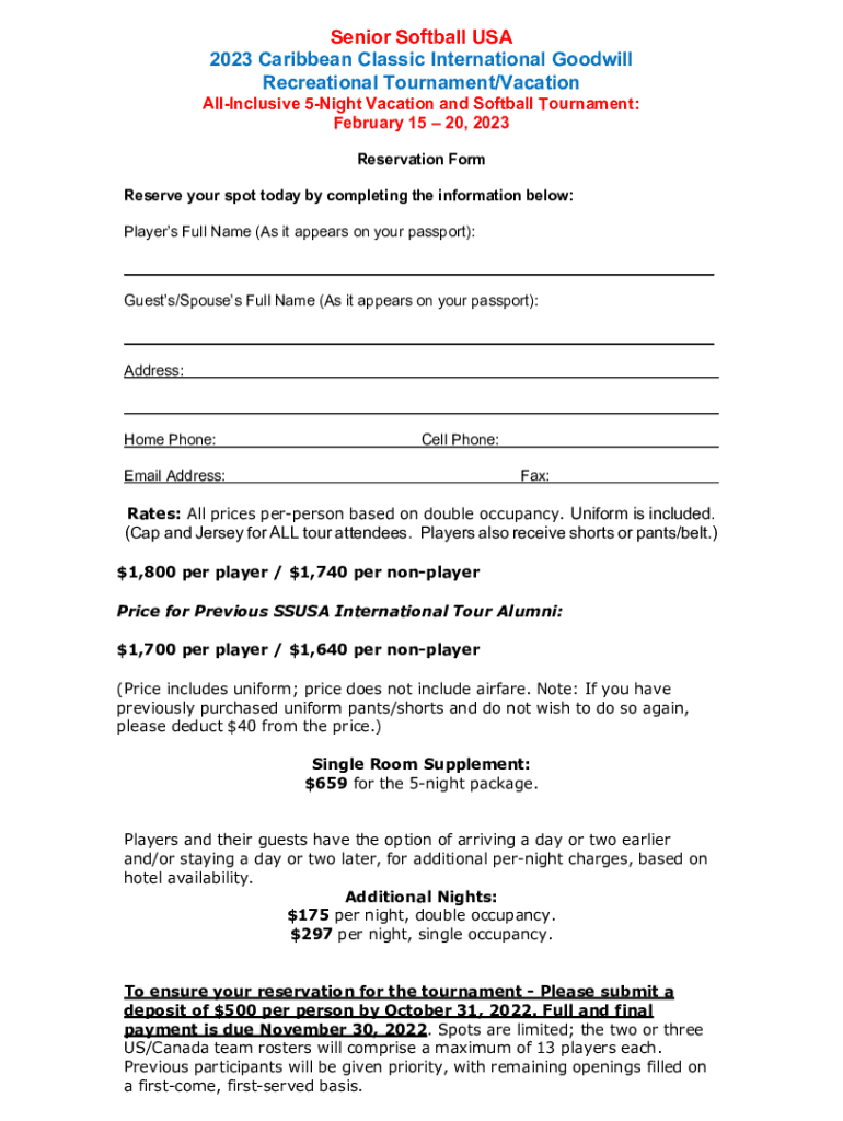 Senior Softball USA 2023 Caribbean Classic International Goodwill Recreational Tournament/Vacation Inclusive 5Night Vacation and Softball Tournament: February 15 20, 2023 Reservation Form Reserve