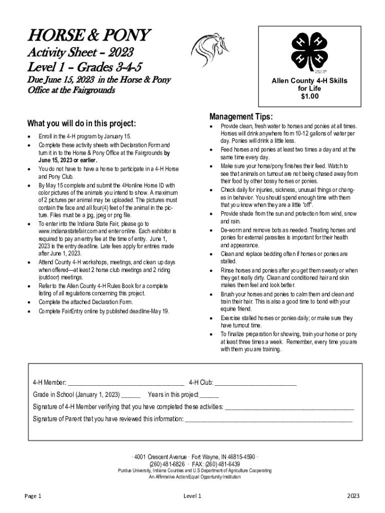 HORSE & PONY Activity Sheet 2023 Level 1 Grades 345 Due June 15, 2023, in the Horse & Pony Office at the Fairgrounds Allen County 4H Skills for Life $1.00Management Tips:What you will do in this project: