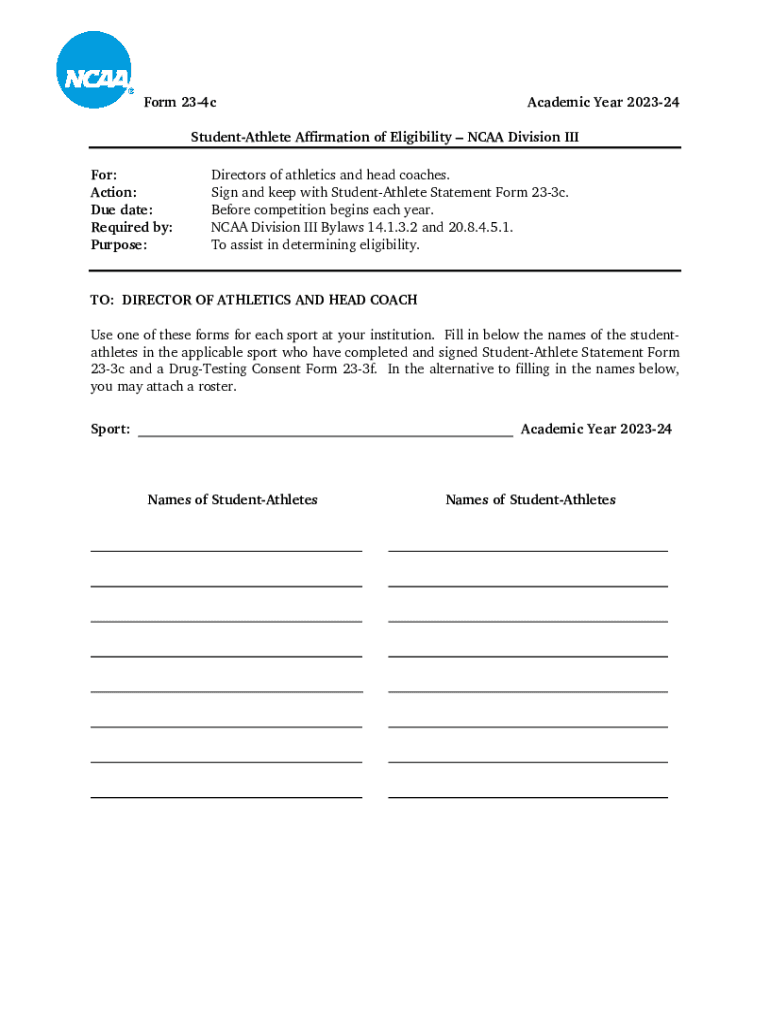 Form 234cAcademic Year 202324StudentAthlete Affirmation of Eligibility NCAA Division III For: Action: Due date: Required by: Purpose:Directors of athletics and head coaches. Sign and keep with StudentAthlete