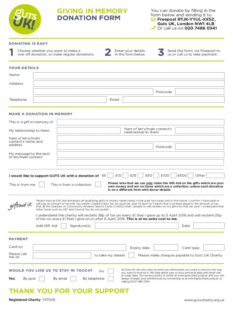 GIVING IN MEMORY DONATION FORMULATING IS EASY12Choose whether you want to make a one off donation, or make regular donations. You can donate by filling in the form below and sending it to Free post