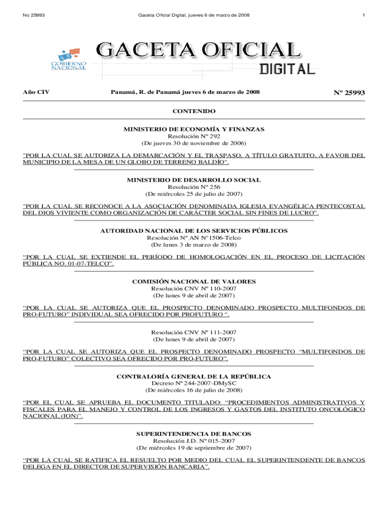 No 25993Ao CIVGaceta Official Digital, Jeeves 6 de Mario de 2008Panam, R. de Panama Jeeves 6 de Mario de 20081 N 25993CONTENIDO