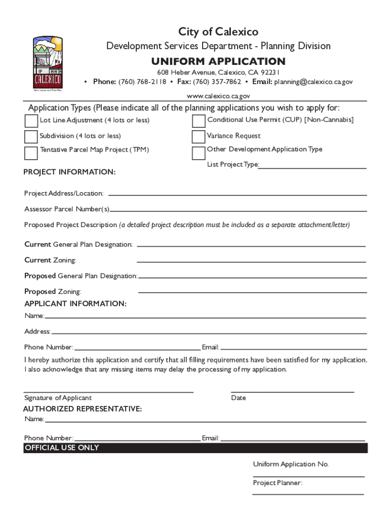 City of Calexico Development Services Department Planning Division UNIFORM APPLICATION608 Weber Avenue, Calexico, CA 92231 Phone: (760) 7682118 Fax: (760) 3577862 Email: planning@calexico.ca.gov www.calexico.ca.govApplication
