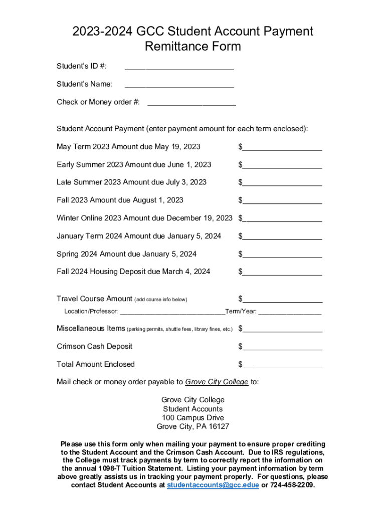 20232024 GCC Student Account Payment Remittance Form Students ID #:___Students Name:___Check or Money order #: ___ Student Account Payment (enter payment amount for each term enclosed): May Term 2023