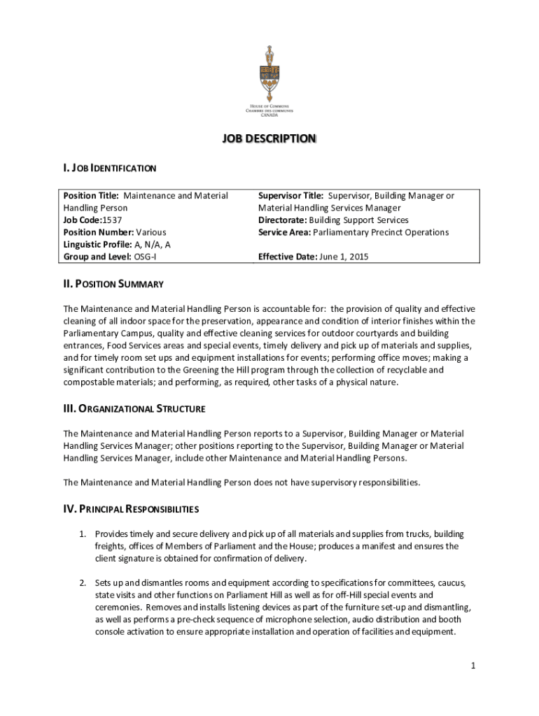 JOB DESCRIPTION I. JOB IDENTIFICATION Position Title: Maintenance and Material Handling Person Job Code:1537 Position Number: Various Linguistic Profile: A, N/A, A Group and Level: OSGISupervisor