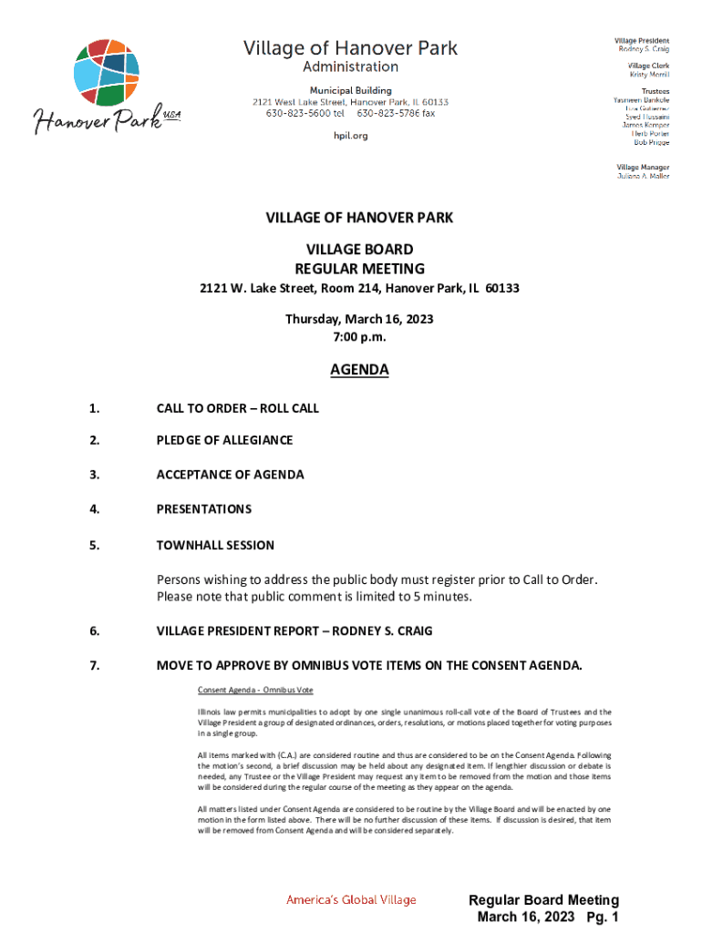 VILLAGE OF HANOVER PARK VILLAGE BOARD REGULAR MEETING2121 W. Lake Street, Room 214, Hanover Park, IL 60133 Thursday, March 16, 2023 7:00 p.m.AGENDA 1.CALL TO ORDER ROLL CALL2.PLEDGE OF ALLEGIANCE3.ACCEPTANCE