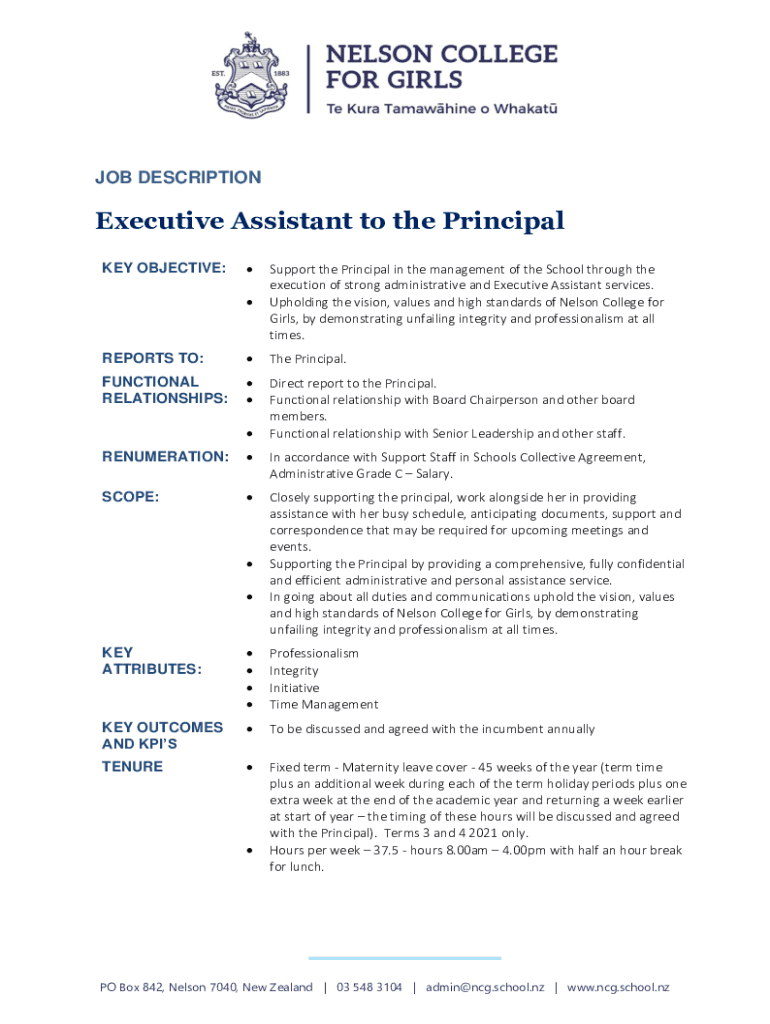 JOB DESCRIPTIONExecutive Assistant to the Principal KEY OBJECTIVE: Support the Principal in the management of the School through the execution of strong administrative and Executive Assistant services.