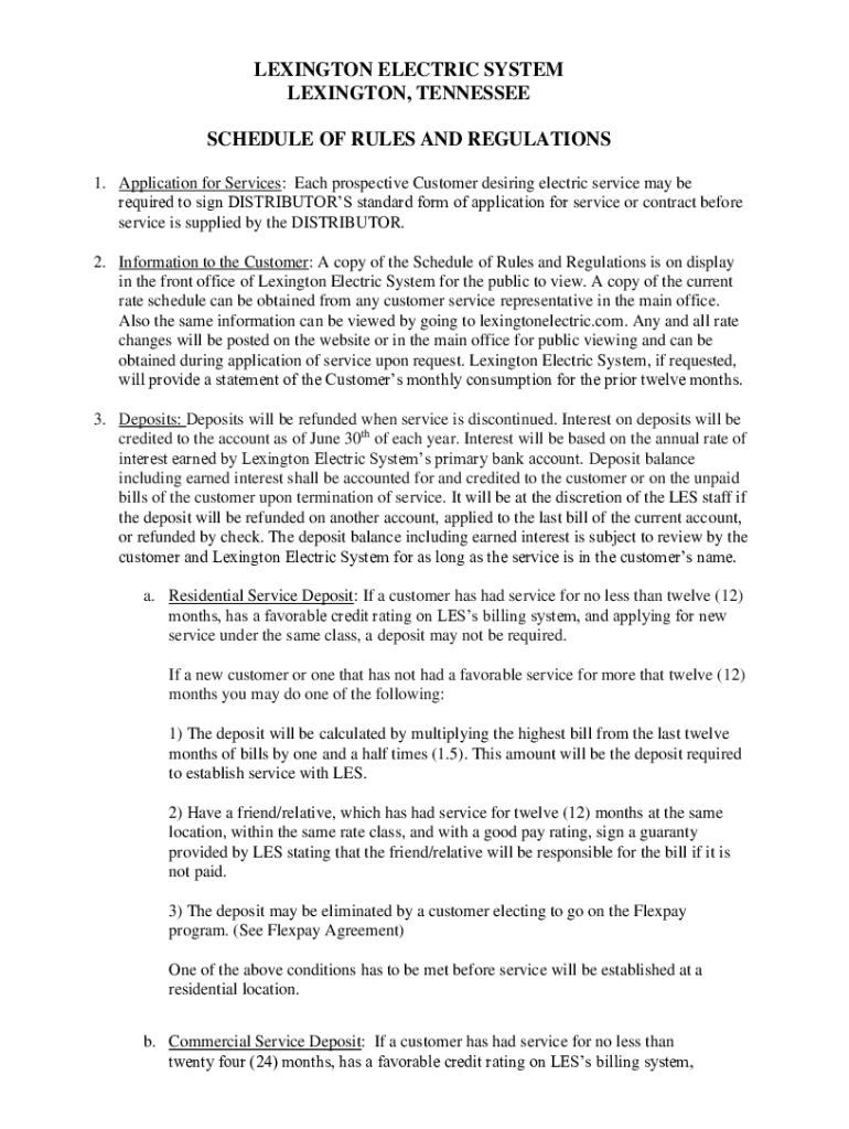 LEXINGTON ELECTRIC SYSTEM LEXINGTON, TENNESSEE SCHEDULE OF RULES AND REGULATIONS 1. Application for Services: Each prospective Customer desiring electric service may be required to sign DISTRIBUTORS