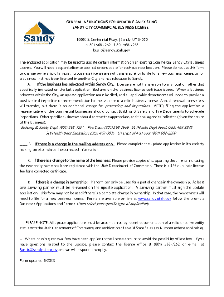 GENERAL INSTRUCTIONS FOR UPDATING AN EXISTING SANDY CITY COMMERCIAL BUSINESS LICENSE 10000 S. Centennial Pkwy. | Sandy, UT 84070 o: 801.568.7252 | f: 801.5687268 buslic@sandy.utah.gov The enclosed