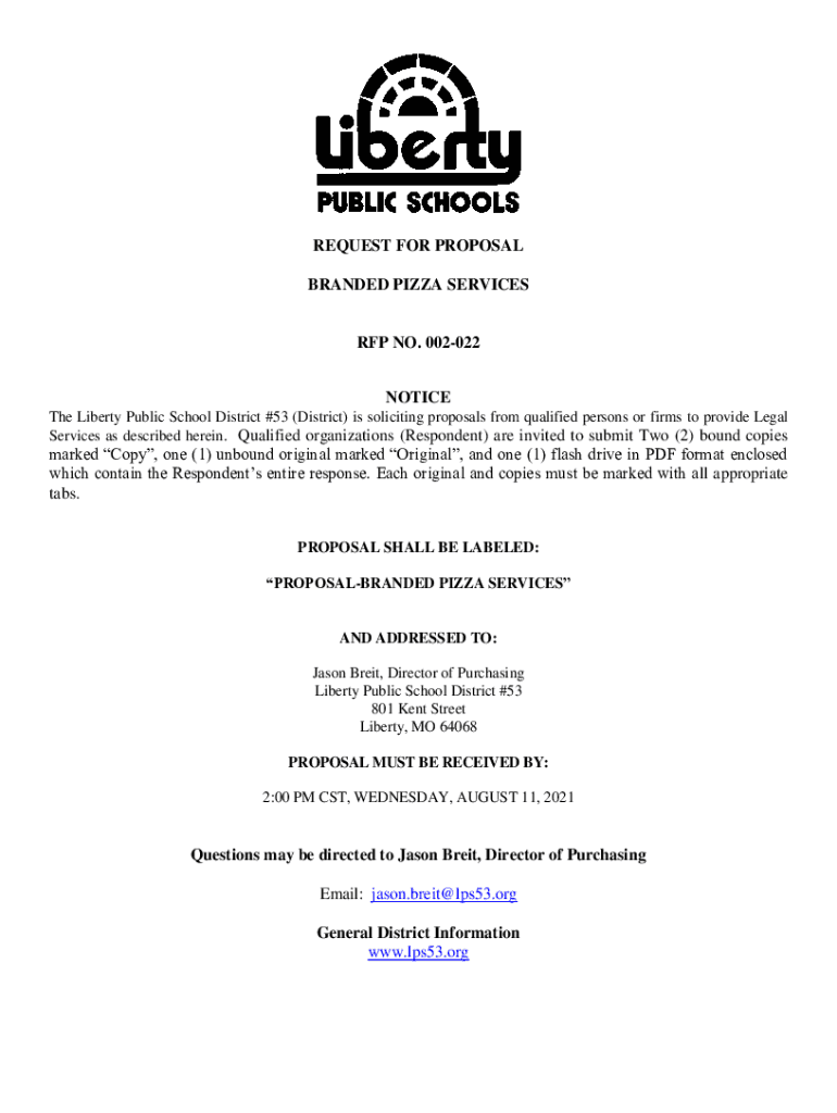 REQUEST FOR PROPOSAL BRANDED PIZZA SERVICES RFP NO. 002022 NOTICE The Liberty Public School District #53 (District) is soliciting proposals from qualified persons or firms to provide Legal Services