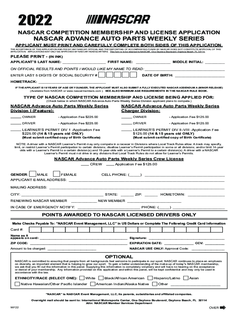 2022NASCAR COMPETITION MEMBERSHIP AND LICENSE APPLICATION NASCAR ADVANCE AUTO PARTS WEEKLY SERIESAPPLICANT MUST PRINT AND CAREFULLY COMPLETE BOTH SIDES OF THIS APPLICATION. THE ACCEPTANCE OF THIS