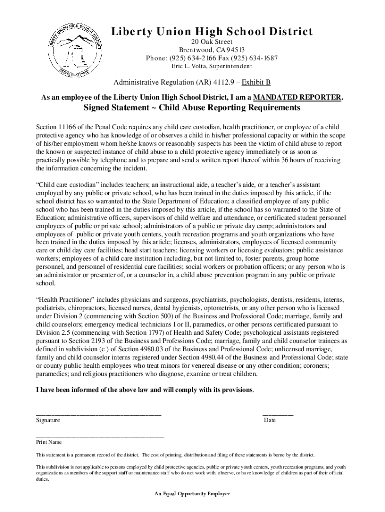 Liberty Union High School District 20 Oak Street Brentwood, CA 94513 Phone: (925) 6342166 Fax (925) 6341687 Eric L. Volta, SuperintendentAdministrative Regulation (AR) 4112.9 Exhibit B As an employee