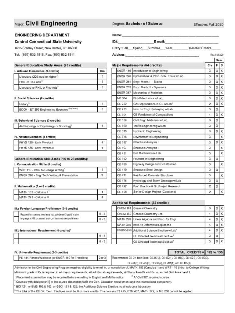 Major:Civil EngineeringDegree: Bachelor of ScienceEffective: Fall 2020ENGINEERING Departmental:___Central Connecticut State University ID#:___ Email:___1615 Stanley Street, New Britain, CT 06050Entry:
