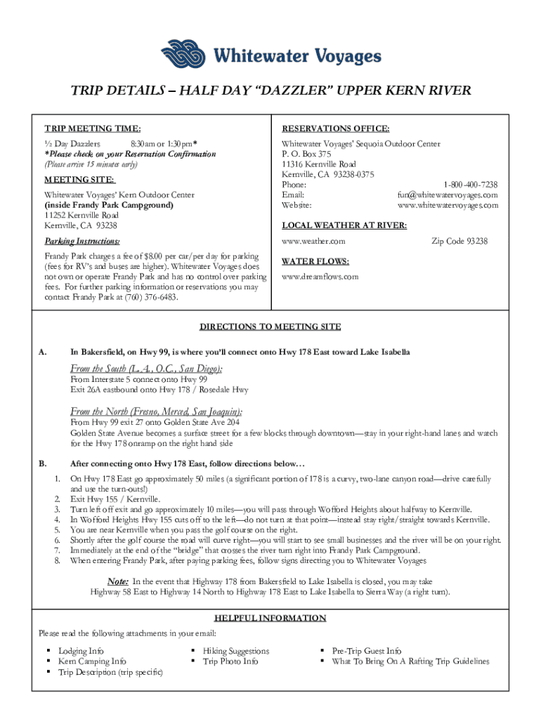 TRIP DETAILS HALF DAY DAZZLER UPPER KERN RIVER TRIP MEETING TIME:RESERVATIONS OFFICE: Day Dazzlers 8:30am or 1:30pm* *Please check on your Reservation Confirmation (Please arrive 15 minutes early)Whitewater