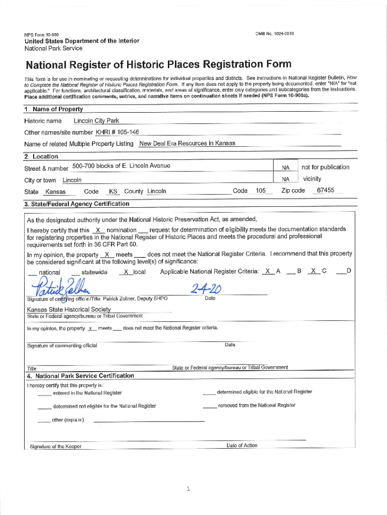 United States Department of the Interior NPS Form 10900National Park Service / National Register of Historic Places Registration Form OMB No. 10240018Lincoln City Park Lincoln Co., KansasName of PropertyCounty