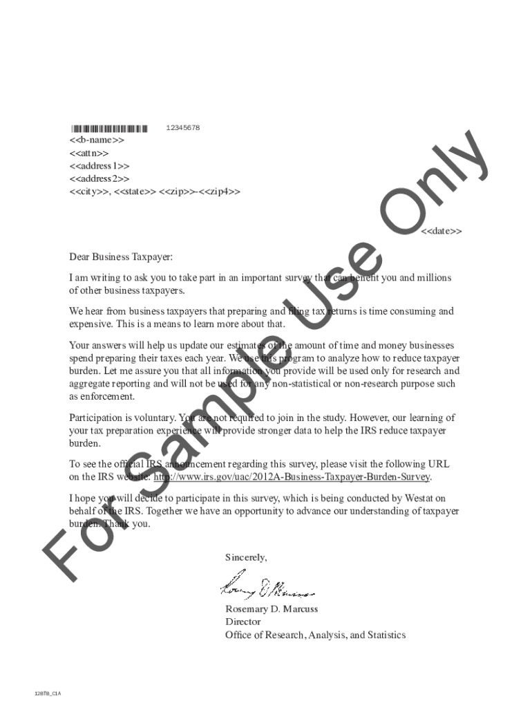 *12345678×12345678Onl name attn address1 address2 city, state zipzip4dateseDear Business Taxpayer:I am writing to ask you to take part in an important survey that can benefit you and millions of