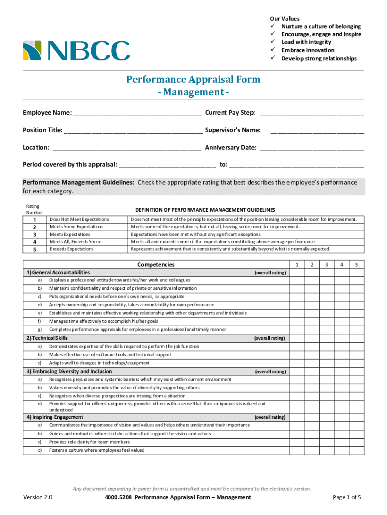 Our Values Nurture a culture of belonging Encourage, engage and inspire Lead with integrity Embrace innovation Develop strong relationshipsPerformance Appraisal Form Management Employee Name: ___