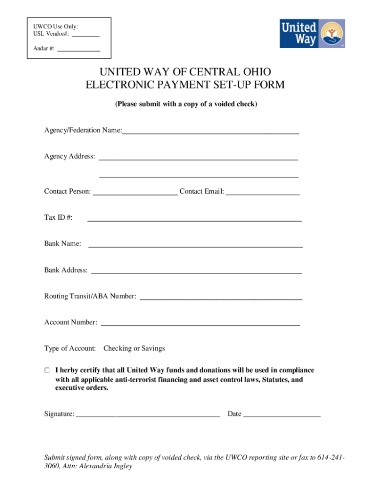 UWC Use Only: US Vendor#: Adar #:UNITED WAY OF CENTRAL OHIO ELECTRONIC PAYMENT SETUP FORM (Please submit with a copy of a voided check)Agency/Federation Name:Agency Address:Contact Person:Contact