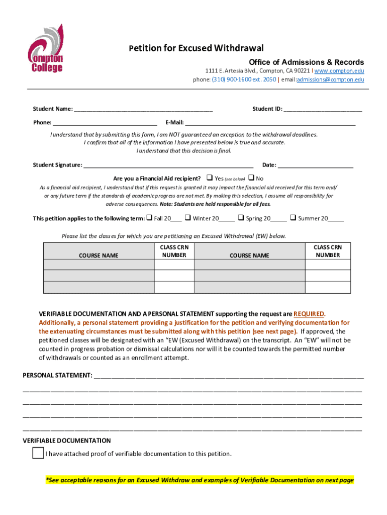 Petition for Excused Withdrawal Office of Admissions & Records1111 E. Artesian Blvd., Compton, CA 90221 l www.compton.edu phone: (310) 9001600 ext. 2050 | email:admissions@compton.student Name: ___Student