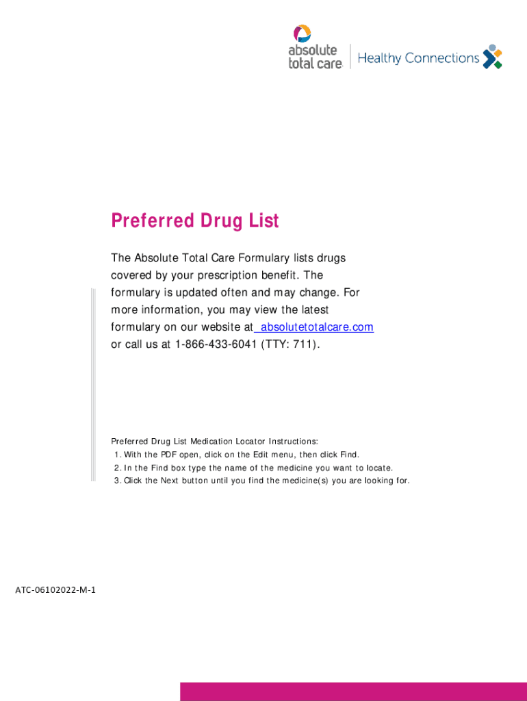 (., absolute total care. Preferred Drug List The Absolute Total Care Formulary lists drugs covered by your prescription benefit. The formulary is updated often and may change. For more information,