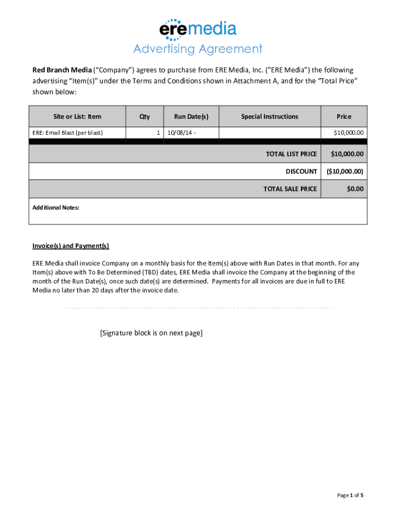 Advertising Agreement Red Branch Media (Company) agrees to purchase from ERE Media, Inc. (\” ERE Media\”) the following advertising Item(s) under the Terms and Conditions shown in Attachment A,