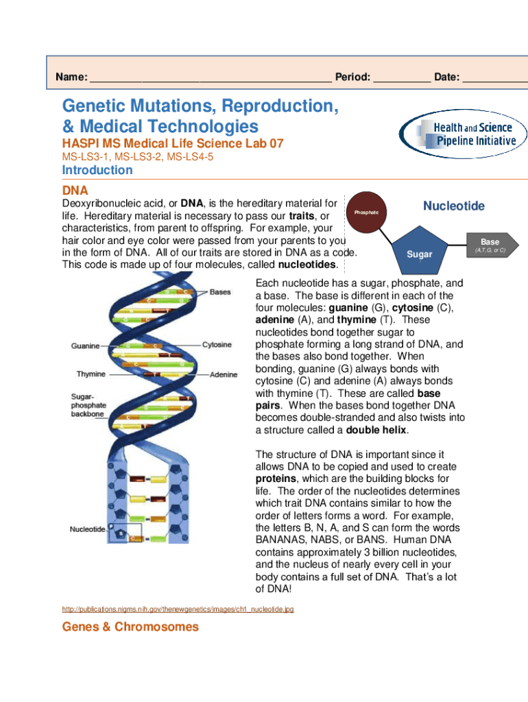 Name: ___ Period: ___ Date: ___Genetic Mutations, Reproduction, & Medical Technologies HASP MS Medical Life Science Lab 07 MSLS31, MSLS32, MSLS45Introduction DNA! ! ! ! ! ! ! ! ! ! ! ! ! ! ! ! ! !