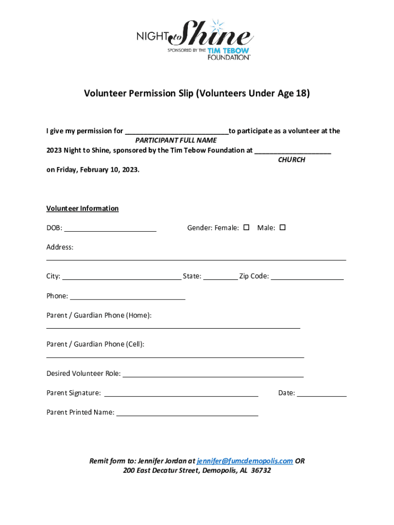 Volunteer Permission Slip (Volunteers Under Age 18) I give my permission for ___to participate as a volunteer at the PARTICIPANT FULL NAME 2023 Night to Shine, sponsored by the Tim Te bow Foundation