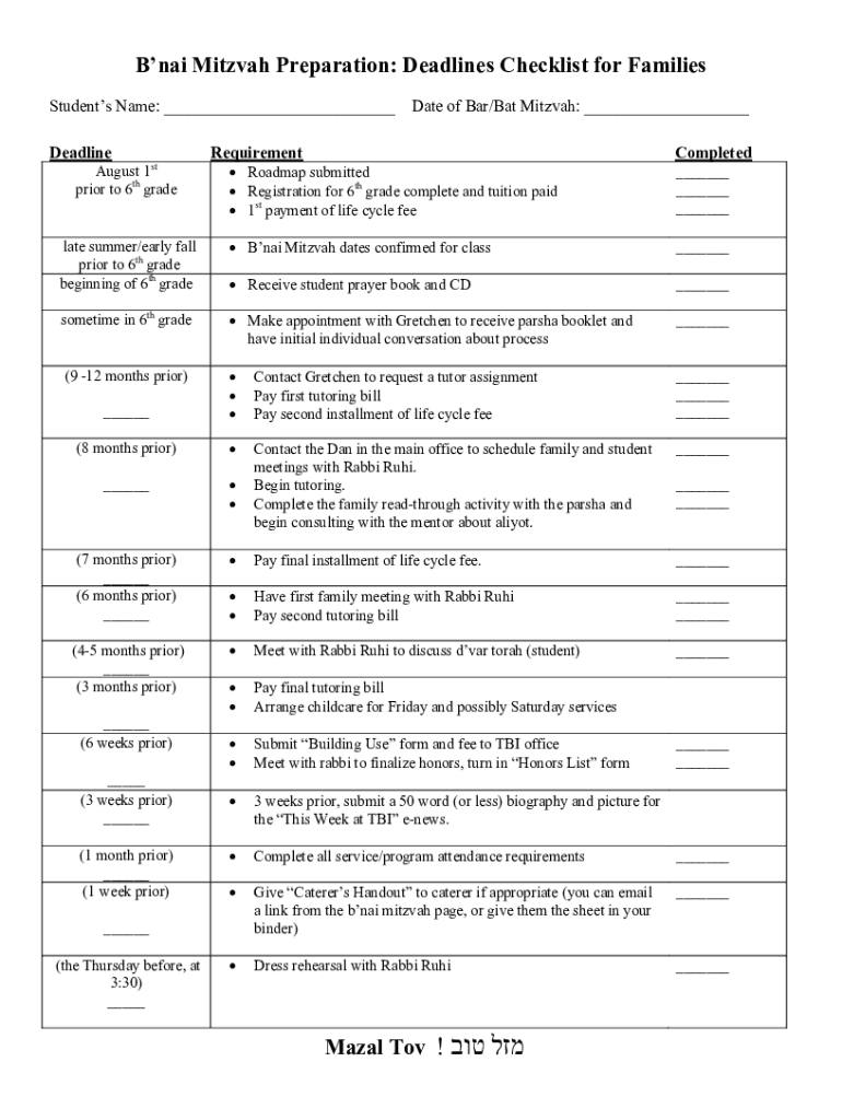 Bani Mitzvah Preparation: Deadlines Checklist for Families Students Name: ___ DeadlinestDate of Bar/Bat Mitzvah: ___RequirementCompleted Roadmap submitted Registration for 6th grade complete and tuition