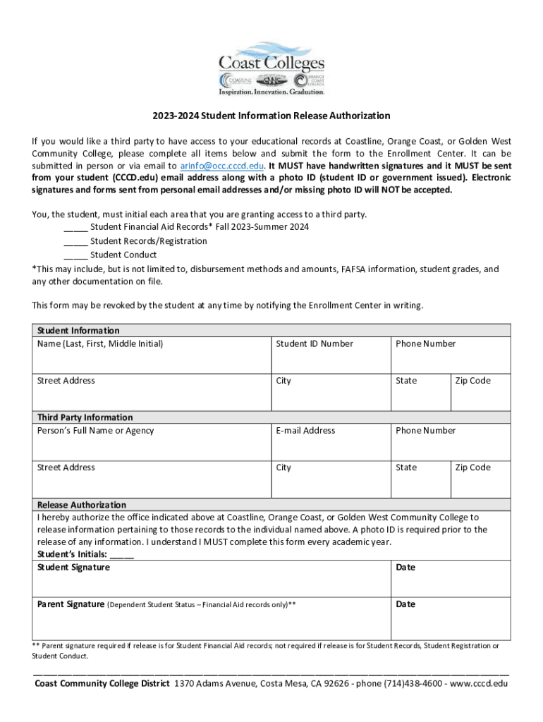 20232024 Student Information Release Authorization If you would like a third party to have access to your educational records at Coastline, Orange Coast, or Golden West Community College, please complete