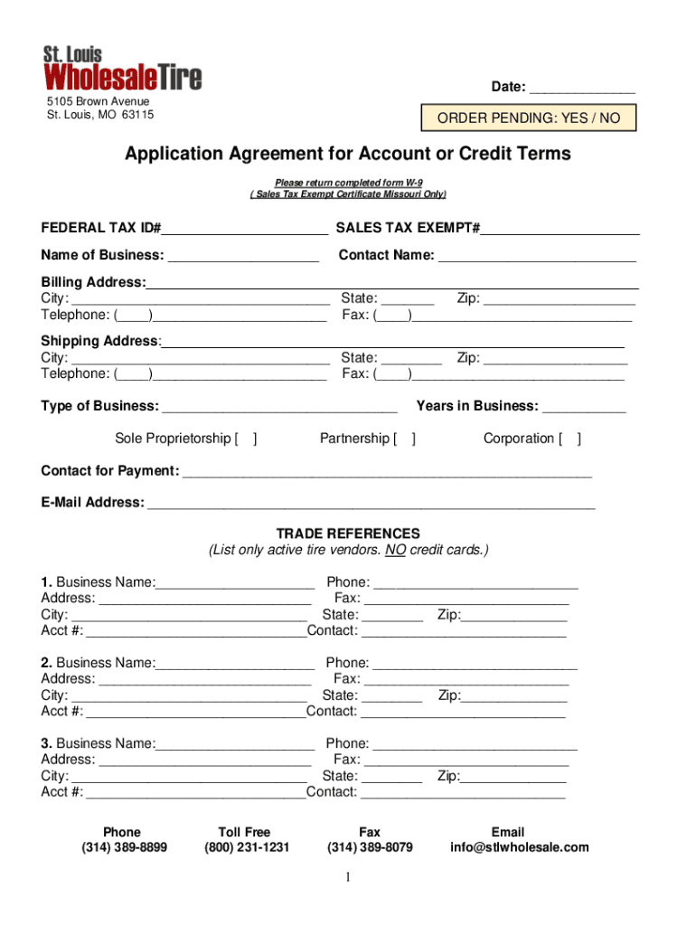 Date: ___ 5105 Brown Avenue St. Louis, MO 63115ORDER PENDING: YES / Application Agreement for Account or Credit Terms Please return completed form W9 (Sales Tax Exempt Certificate Missouri Only)FEDERAL