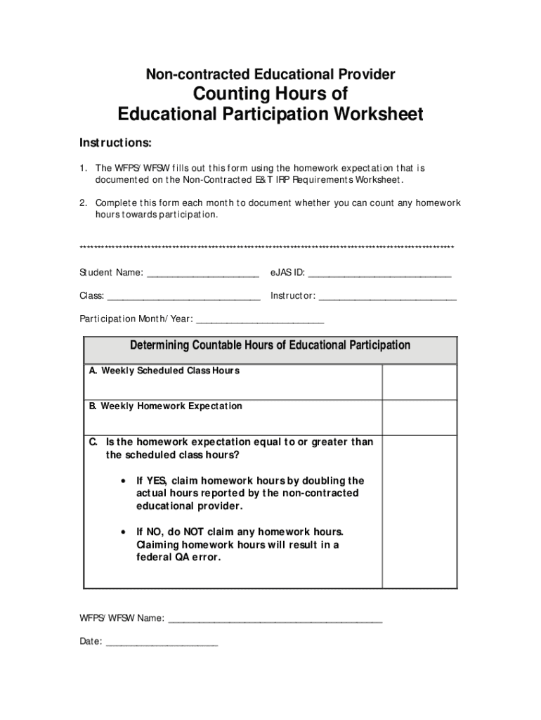 Noncontracted Educational ProviderCounting Hours of Educational Participation Worksheet Instructions: 1. The FPS/WSW fills out this form using the homework expectation that is documented on the Concentrated