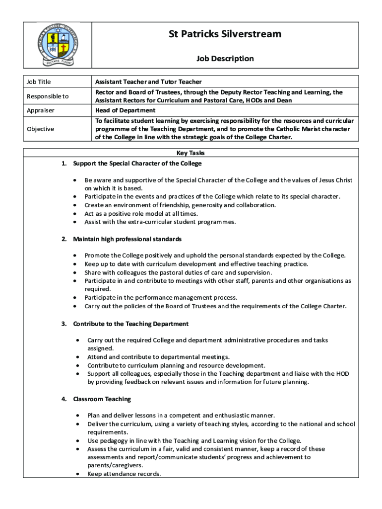 Job TitleAssistant Teacher and Tutor TeacherResponsible director and Board of Trustees, through the Deputy Rector Teaching and Learning, the