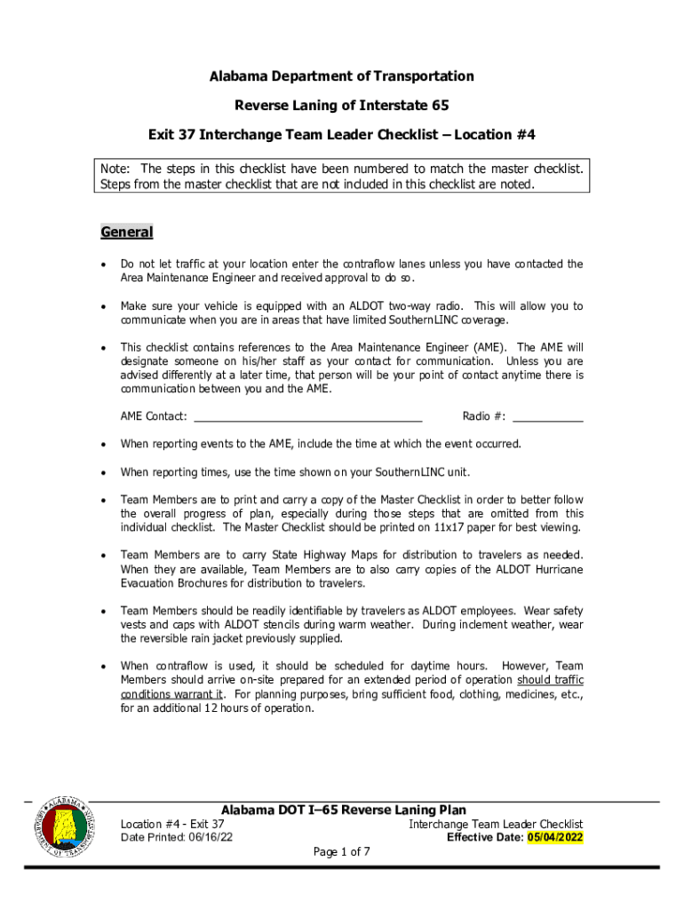 Alabama Department of Transportation Reverse Landing of Interstate 65 Exit 37 Interchange Team Leader Checklist Location #4 Note: The steps in this checklist have been numbered to match the master