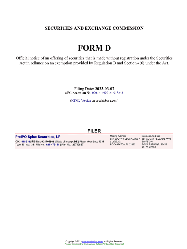 Get the free PreIPO Spice Securities, LP Form D Filed 2023-03-07. Accession Number