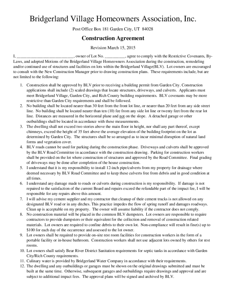 Bridger land Village Homeowners Association, Inc. Post Office Box 181 Garden City, UT 84028Construction Agreement Revision March 15, 2015, I, ___, owner of Lot No. ___, agree to comply with the Restrictive