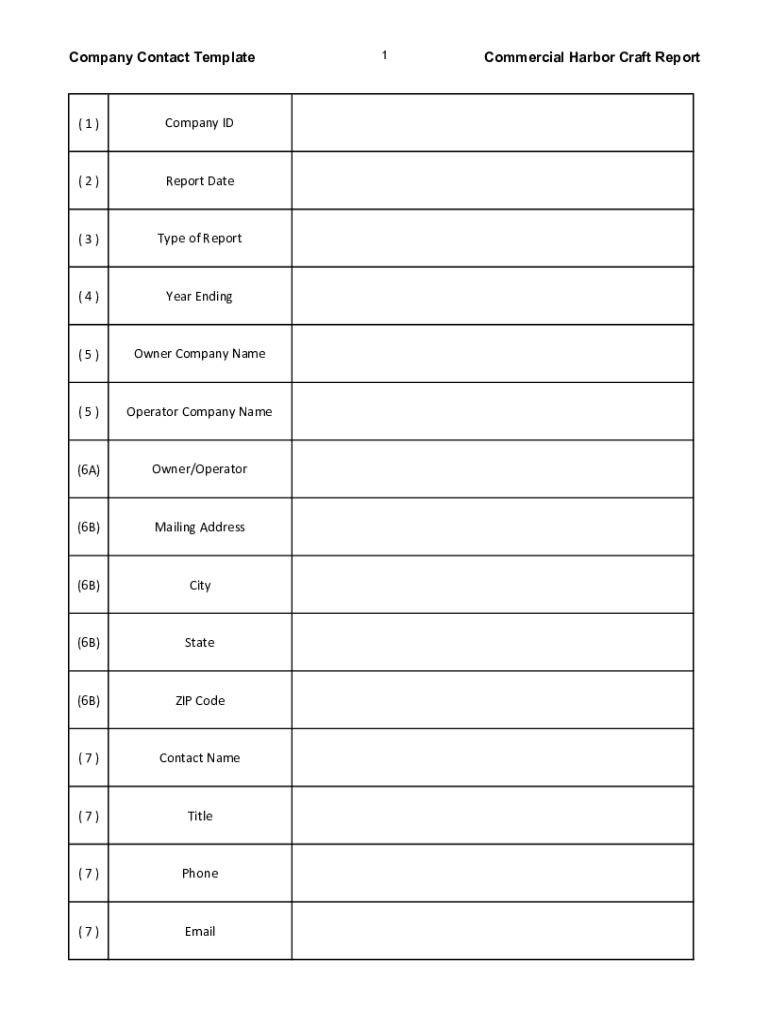 Company Contact Template(1)Company ID(2)Report Date(3)Type of Report(4)Year Ending(5)Owner Company Name(5)Operator Company Name(6A)Owner/Operator(6B)Mailing Address(6B)City(6B)State(6B)ZIP Code(7)Contact
