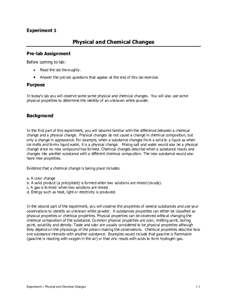 Experiment 1Physical and Chemical Changes Prelab Assignment Before coming to lab: Read the lab thoroughly. Answer the prelab questions that appear at the end of this lab exercise. Purpose In today\'s