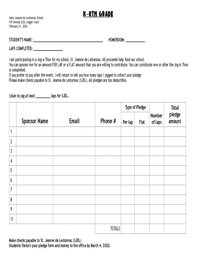 K8th greasepaint Jeanne de Lestonnac School 10th Annual JDL Jogger Joust February 21, 2020STUDENTS NAME: ___HOMEROOM: ___LAPS COMPLETED: ___ I am participating in a Jonathon for my school, St. Jeanne