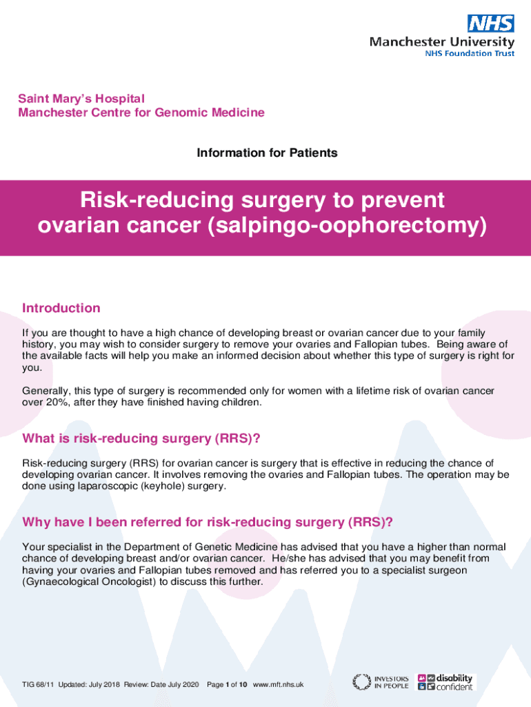 Saint Mary's Hospital Manchester Center for Genomic MedicineInformation for PatientsRiskreducing surgery to prevent ovarian cancer (salpingooophorectomy)Introduction If you are thought to have a high
