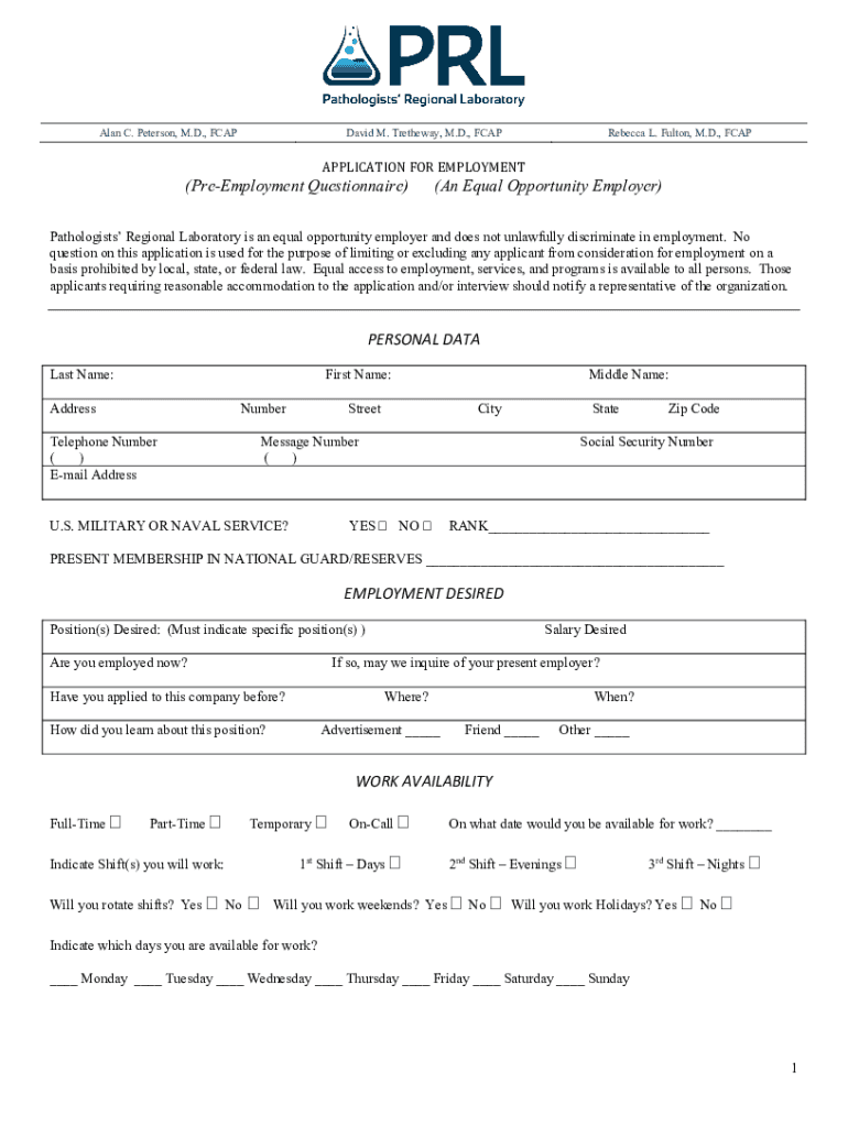 Alan C. Peterson, M.D., FCAPDavid M. Trethewey, M.D., FCAPRebecca L. Fulton, M.D., FCAPAPPLICATION FOR EMPLOYMENT(PreEmployment Questionnaire)(An Equal Opportunity Employer)Pathologists Regional Laboratory