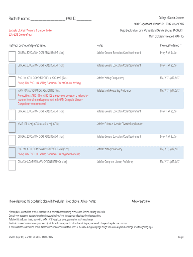 Student\'s name: ___ EU ID: ___College of Social Sciences SOAR Department: Women\'s St | SOAR Major: GNDRBachelor of Arts in Women\'s & Gender Studies 20172018 Catalog Headfirst year courses and prerequisites
