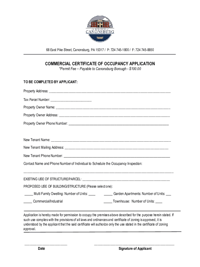 68 East Pike Street, Canonsburg, PA 15317 / P: 724 7451800 / F: 724 7458850COMMERCIAL CERTIFICATE OF OCCUPANCY APPLICATION *Permit Fee Payable to Canonsburg Borough $100.00 TO BE COMPLETED BY APPLICANT: