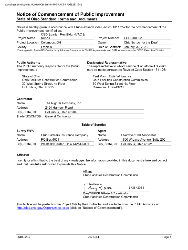DocuSign Envelope ID: 9DA8A0CBEB184460AAC6F7D85287124BNotice of Commencement of Public Improvement State of Ohio Standard Forms and DocumentsNotice is hereby given in accordance with Ohio Revised