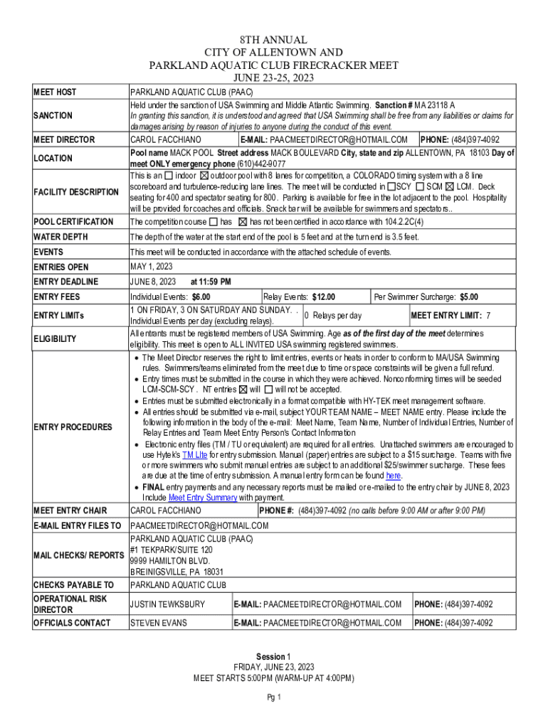 8TH ANNUAL CITY OF ALLENTOWN AND PARKLAND AQUATIC CLUB FIRECRACKER MEET JUNE 2325, 2023 MEET HOSTEL CERTIFICATIONPARKLAND AQUATIC CLUB (PAC) Held under the sanction of USA Swimming and Middle Atlantic