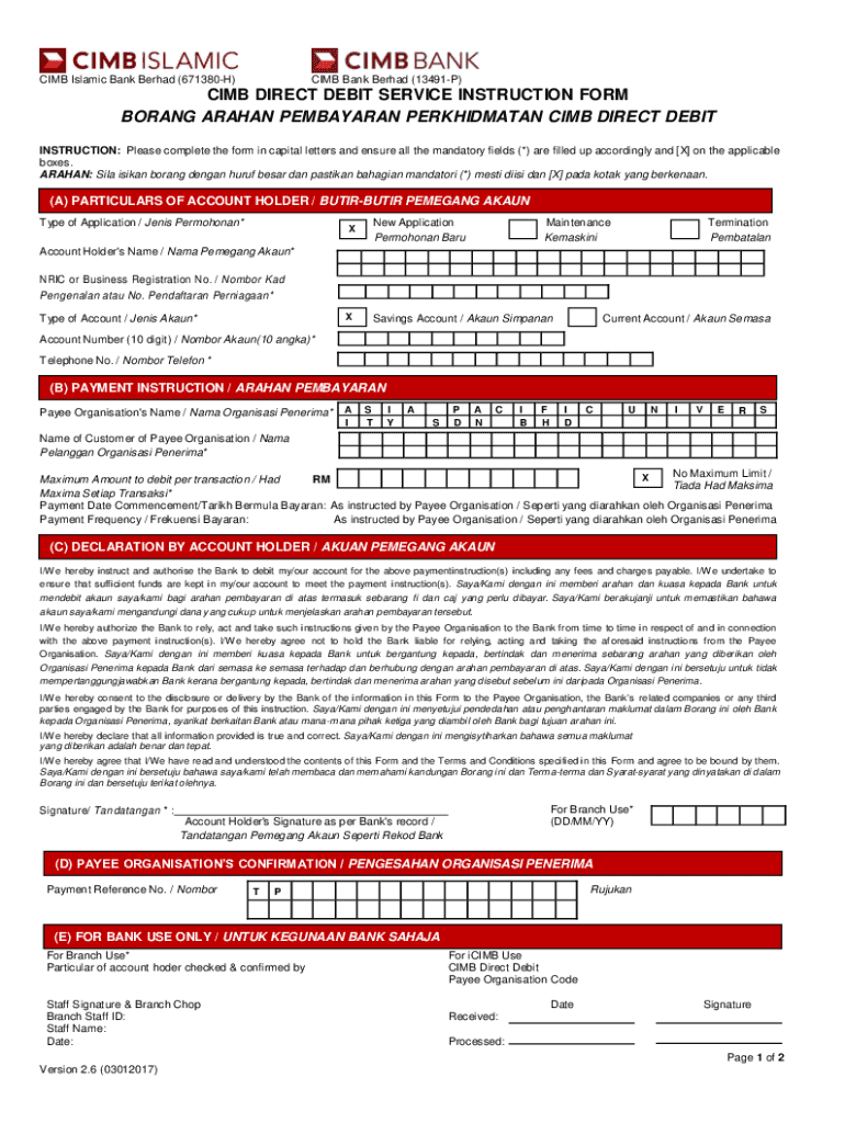 CLIMB Islamic Bank Broad (671380H)CLIMB Bank Broad (13491P)CLIMB DIRECT DEBIT SERVICE INSTRUCTION FORM